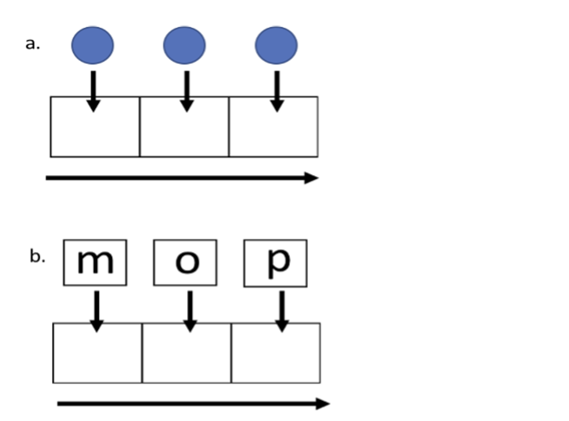 Sound boxes (Figure 1.2) can be used when students are learning words with two or three sounds using a set of boxes that matches the number of sounds in the word. If students do not yet know letter-sound relationships, disks can be used for this activity (see example a). Once students know letter-sound relationships, they can use letter tiles for this activity (see example b).