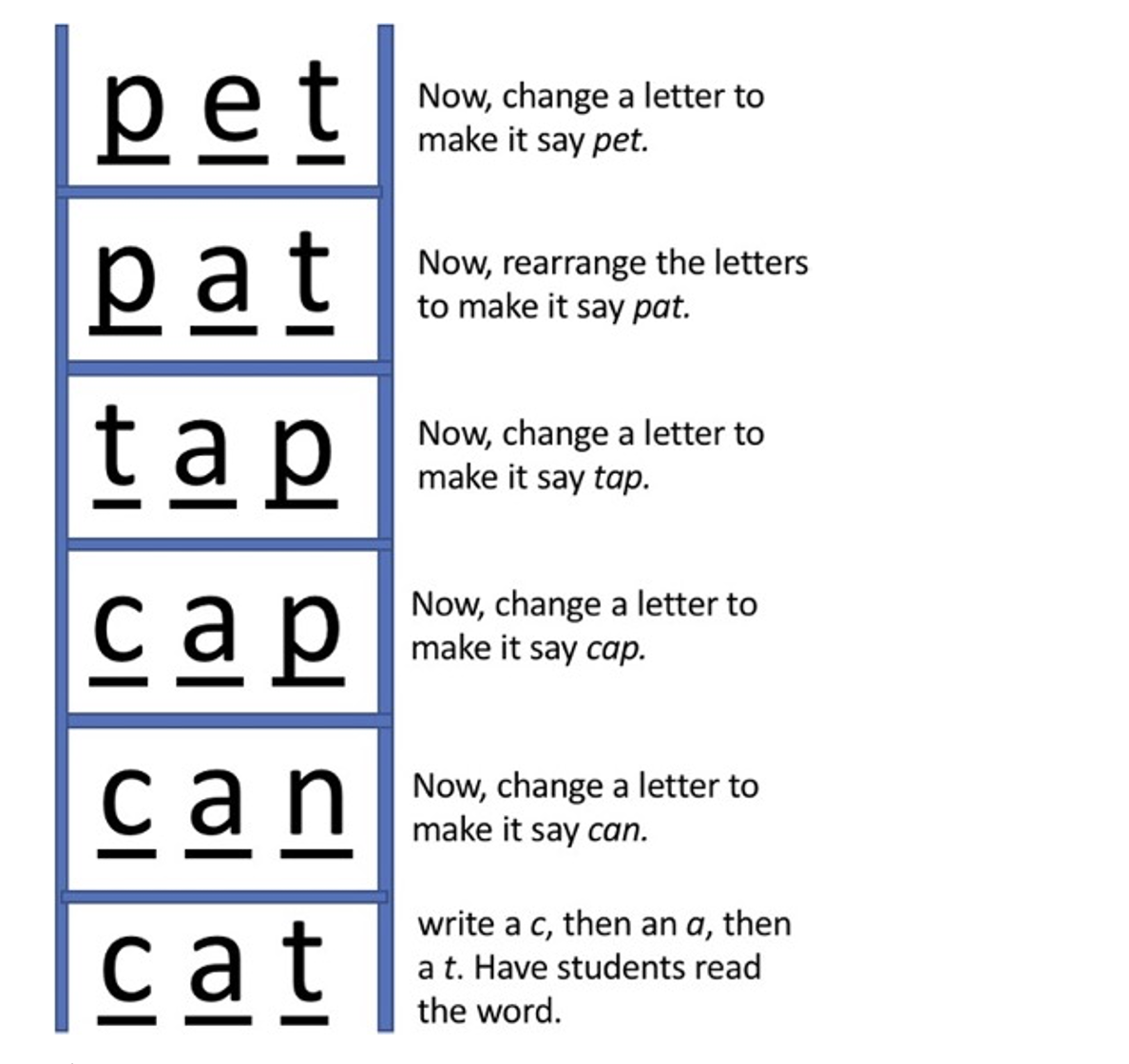 The instructor reads the words to the right of the ladder, starting at the bottom and working up to the top of the ladder. Students can complete this activity by using letter tiles or by writing the appropriate letters in the blanks.