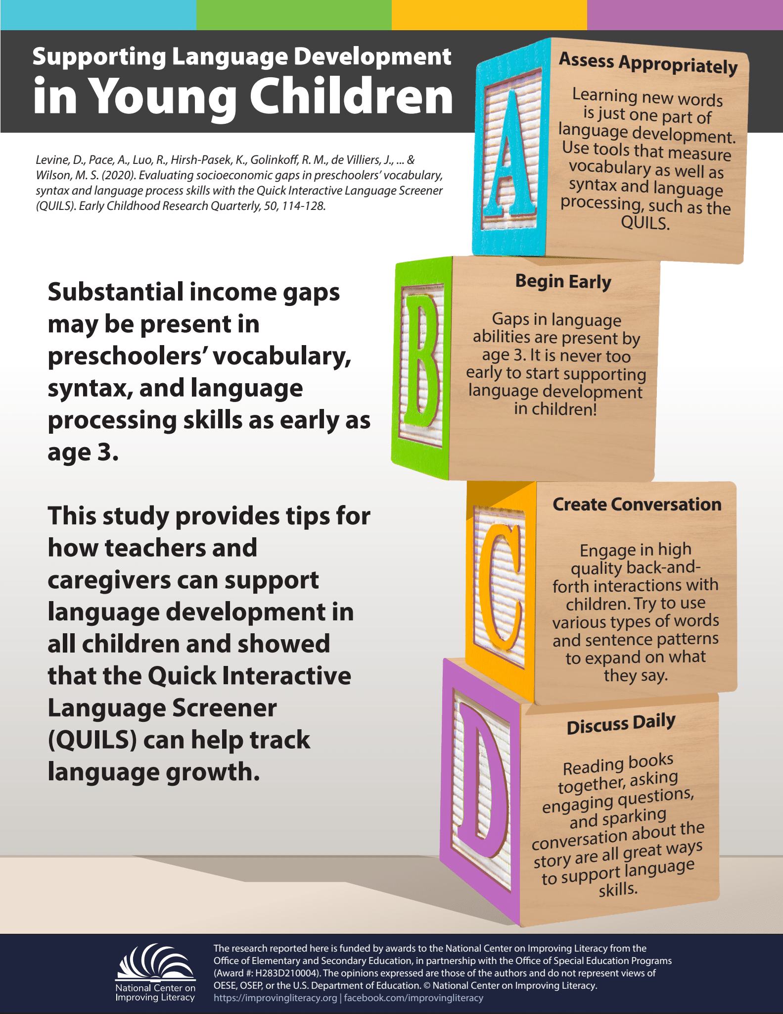 Substantial income gaps may be present in preschoolers’ vocabulary, syntax, and language processing skills as early as age 3. The current study provides tips for how teachers and caregivers can support language development in all children and showed that the Quick Interactive Language Screener (QUILS) can help track language growth.