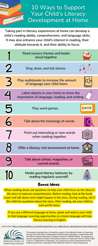 National Center on Improving Literacy. (2017). 10 Ways to Support Your Child’s Literacy at Home.  https://www.improvingliteracy.org/resource/supporting-your-child-s-literacy-at-home