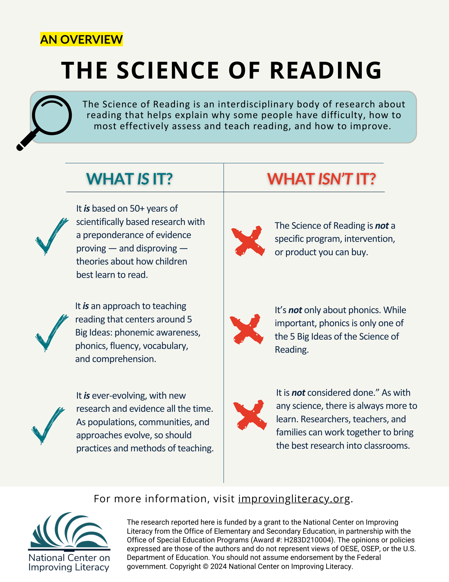The Science of Reading could be considered an approach to teaching reading that is based on decades of research and evidence. It is NOT a specific program.