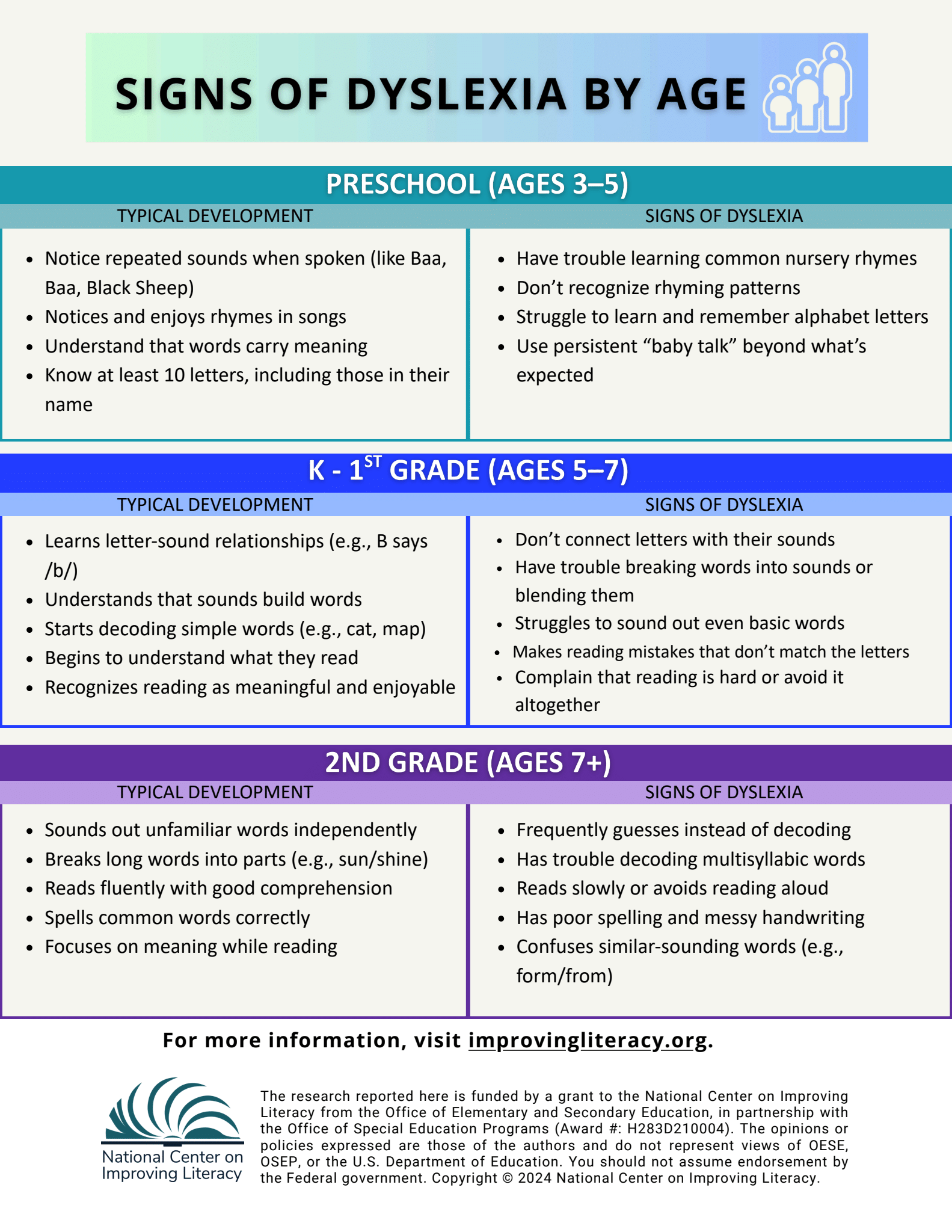 By second grade and up, most children begin to read more fluently and focus on understanding longer texts. Typically developing readers: